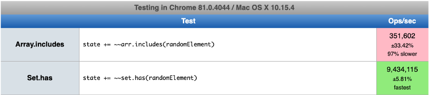 As every programmer, I started googling to find a benchmark. JSPerf is a great resource. It lists hundreds of benchmarks just to compare array and set. The result was not the one I expected. The two most popular tests have opposite conclusions. In experiment (A) array.includes() is faster than set.has() but not in experiment (B).
